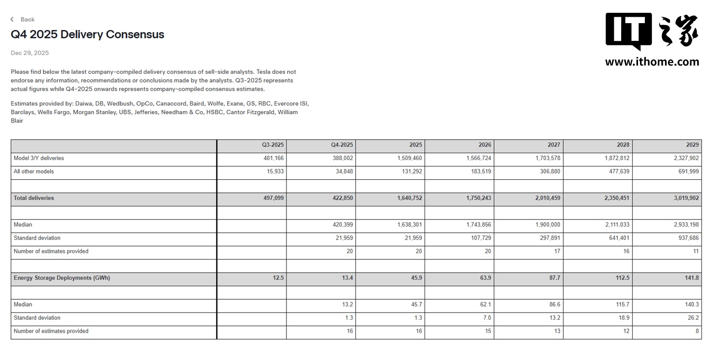IT之家 12 月 30 日消息,特斯拉做出了一项出人意料的举措 —— 通过其投资者关系网站发布的新闻稿,公开了 2025 年第四季度的交付量市场共识预期。这与该车企的标准运营流程大相径庭,似乎预示着特斯拉正试图提前应对这一看似业绩惨淡的季度。